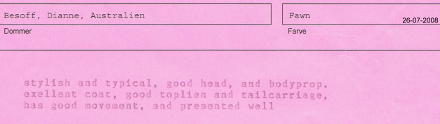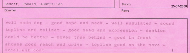 | Godt opdrættet hund - god baghovede og hals - godt vinklet - sund ryglinje og haleføring - godt hovede og udtryk. Bidet kunne være lidt bedre. Bevæger sig godt bagtil - pæn i front - viser sig godt, gode fremadgribende bevægelser, ryglinjen er stabil i bevægelse - flot pels. |