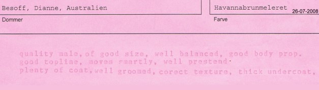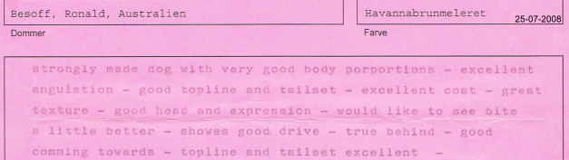 | Kraftig opdrættet hund med meget gode kropsproportioner - flotte vinkler - god ryglinjer og godt ansat hale - flot pels og fremragende struktur - godt hovede og udtryk. Ville gerne have bidet lidt bedre. bevæger sig effektiv - viser sig godt bagtil - bevæger sig godt fremad - fortræffelig ryglinje og haleføring |