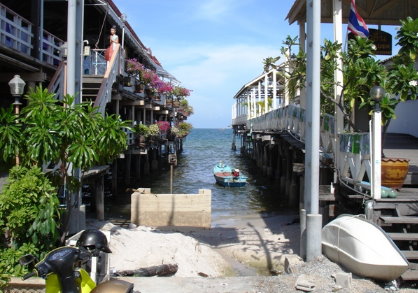 nede ved stranden, og her ligger de små hoteller halvvejs ude i